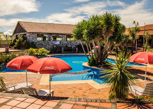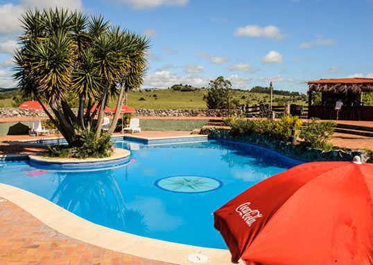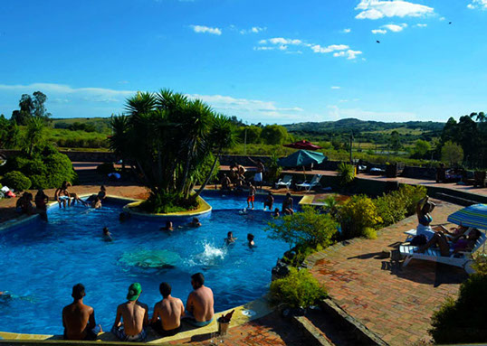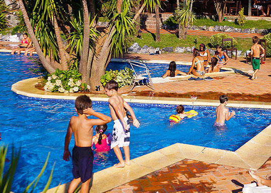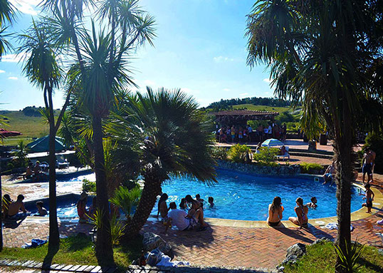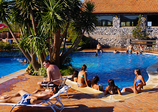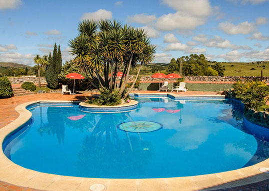 En el centro del complejo amplia piscina abierta con barra de tragos al aire libre